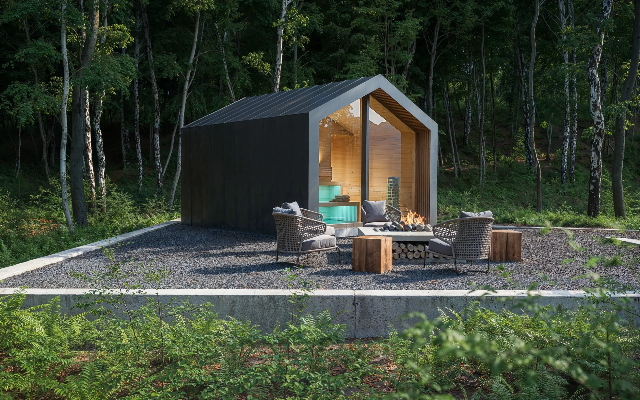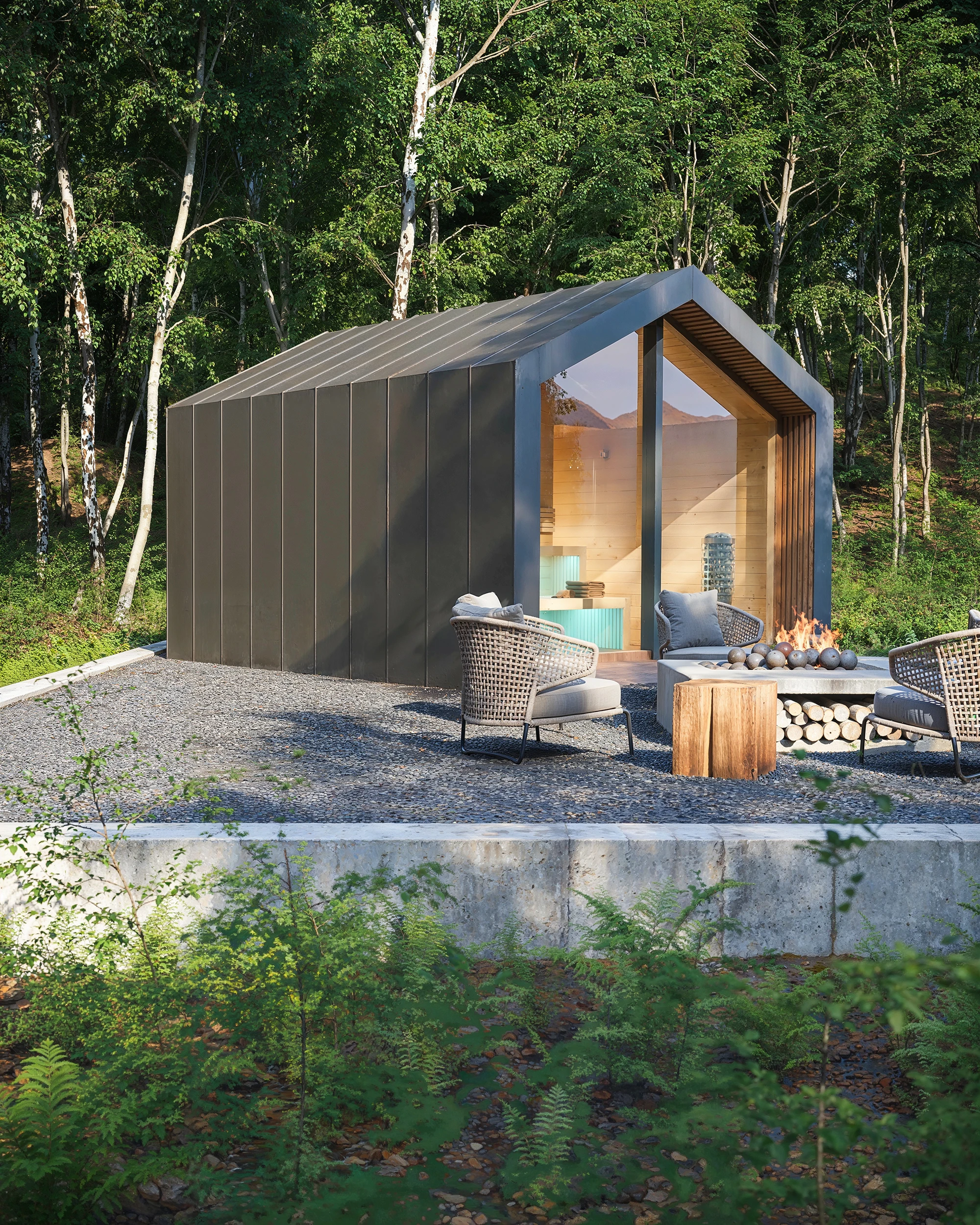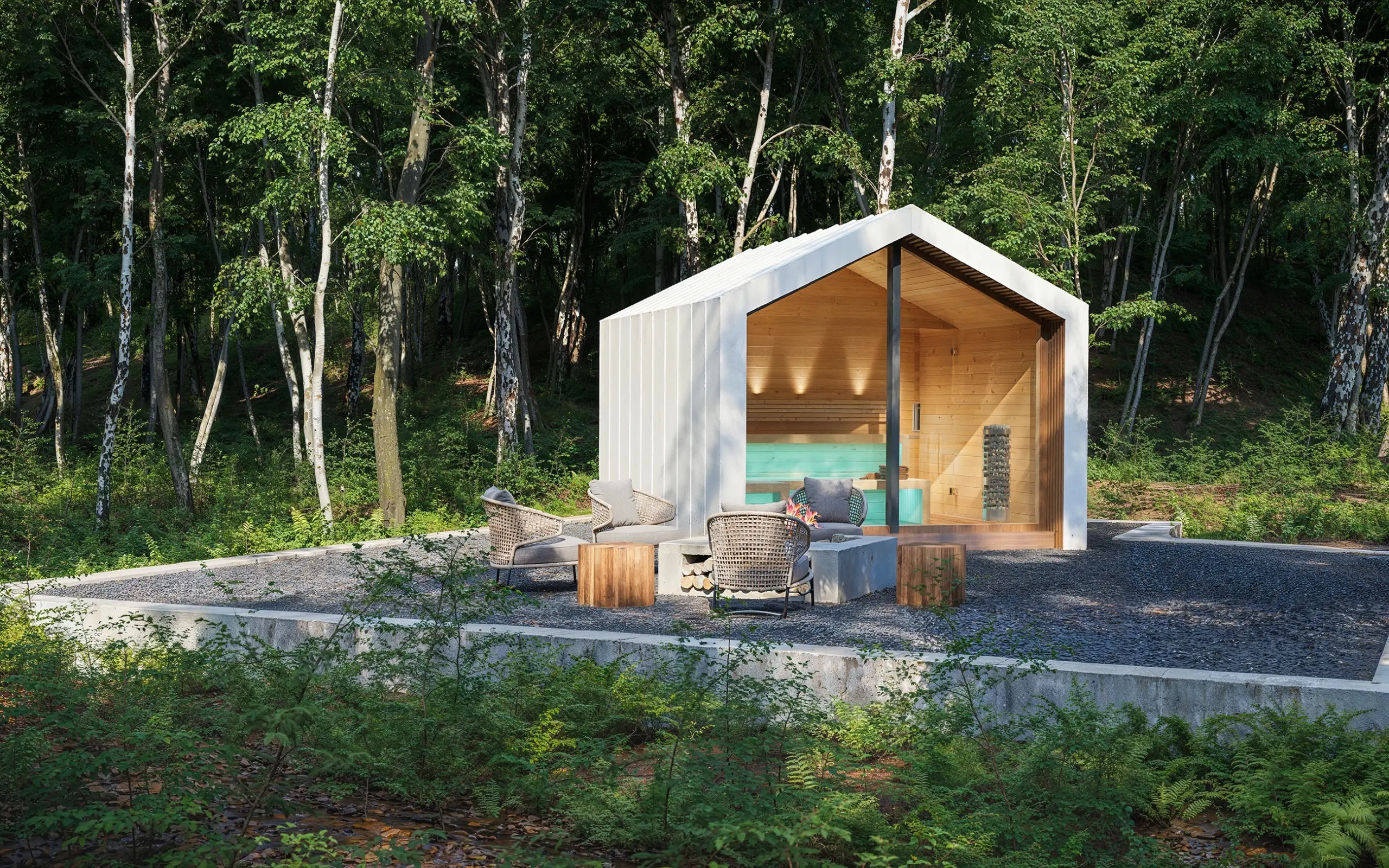 Szaunaház 3D látványtervek – A képen látható modern megjelenésű szaunaházat egy erdei környezetben helyeztük el. Az épületet többféle színvariációban is megjelenítettük. A szaunaházról, és a környezetéről VR 360-as panorámákat is kész ítettünk: https://3dvisiondesign.hu/szauna-latvanyterv-vr-360-as-panorama/