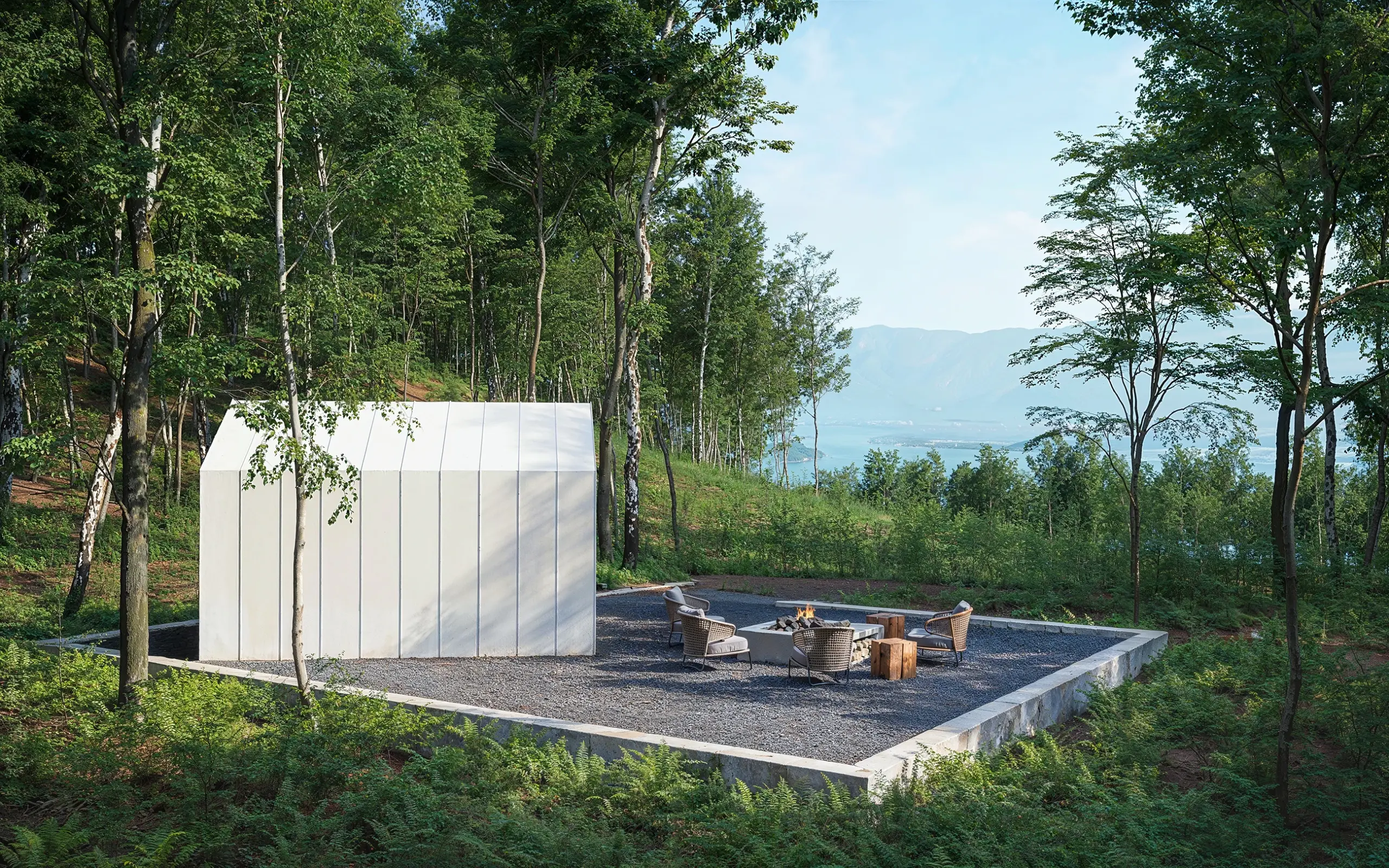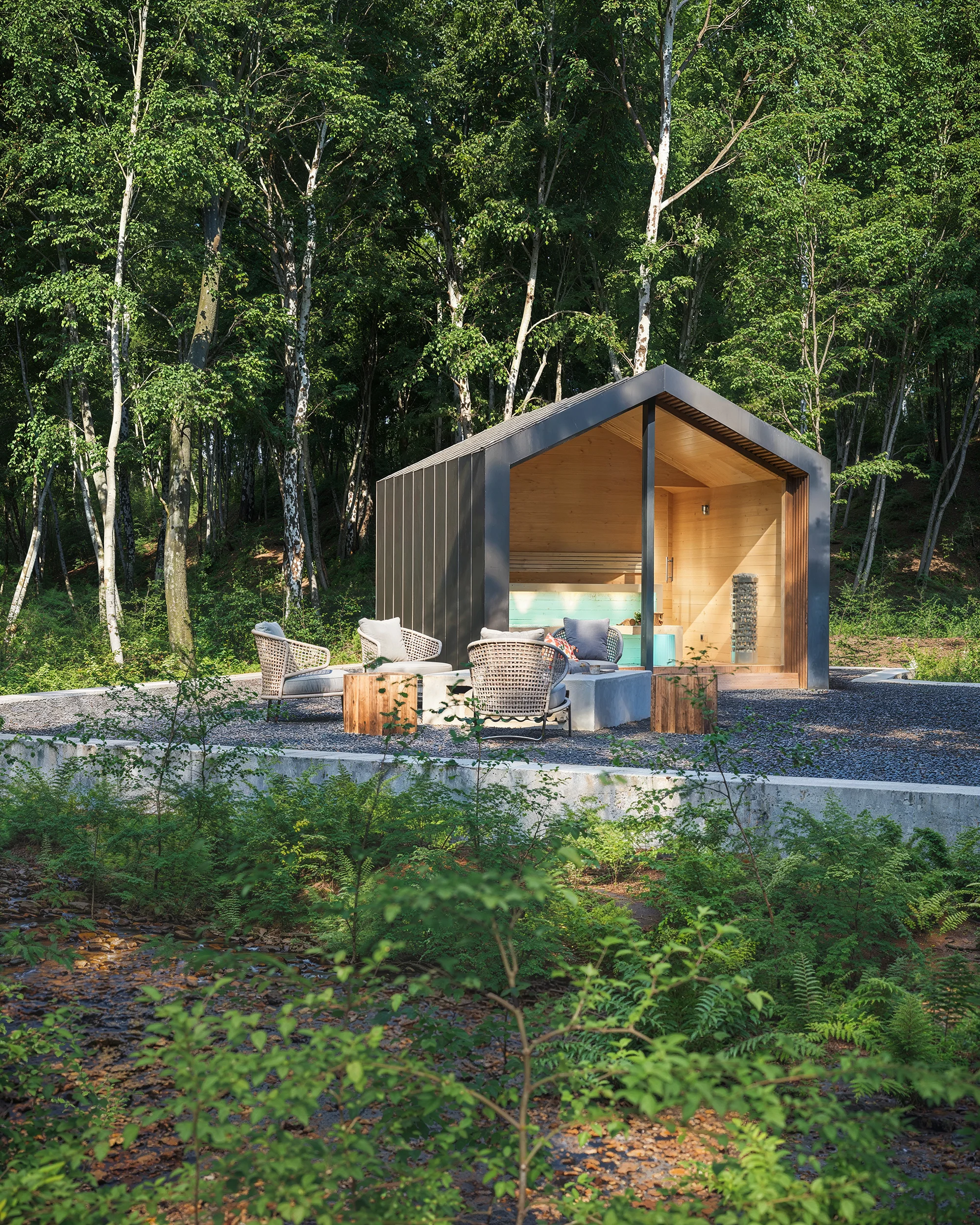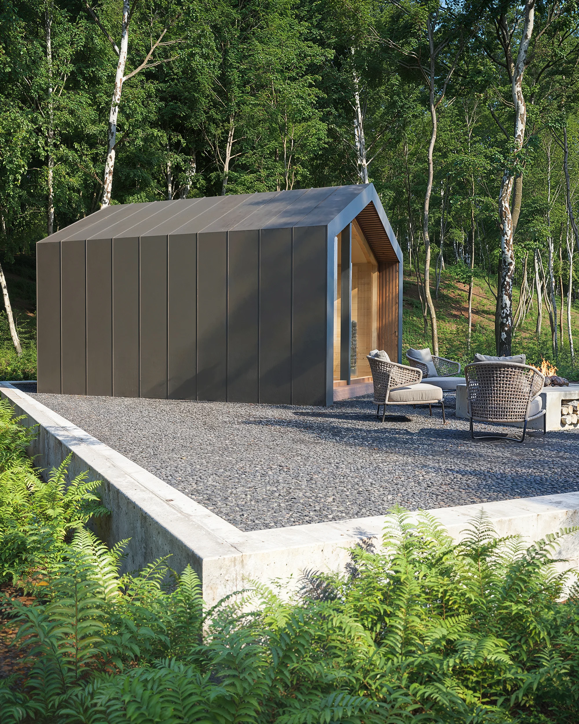 Szaunaház 3D látványtervek – A képen látható modern megjelenésű szaunaházat egy erdei környezetben helyeztük el. Az épületet többféle színvariációban is megjelenítettük. A szaunaházról, és a környezetéről VR 360-as panorámákat is kész ítettünk: https://3dvisiondesign.hu/szauna-latvanyterv-vr-360-as-panorama/